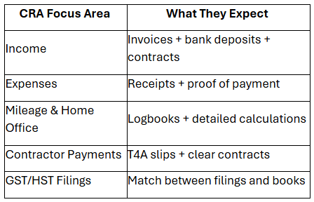 The CRA’s goal is to verify whether you’ve accurately reported your income and claimed only legitimate expenses. Here’s what they’ll typically ask for: