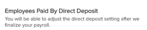 - Under Company Settings Toggle “Employees Paid by Direct Deposit” to No
