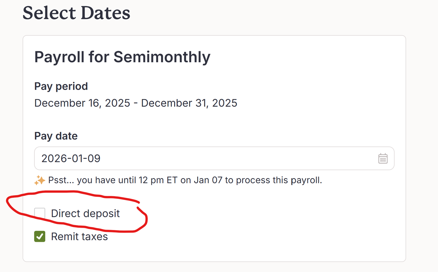 - Uncheck “Direct deposit” (recommend leaving remit taxes as checked)
